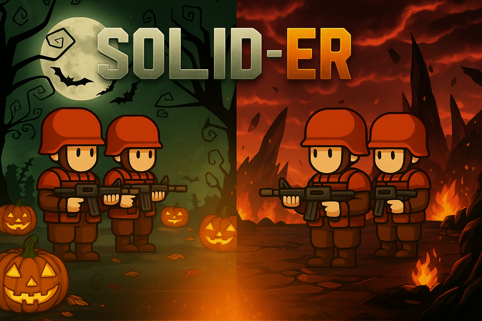 Solid-ER offers gameplay that is easy to learn with simple controls, yet requires quick reflexes and tactical thinking. Each map features a different theme: natural landscapes, hellish regions covered in lava, heavenly platforms above the clouds, or dark Halloween atmospheres. These themes provide players with a new visual experience and different combat conditions each round.
